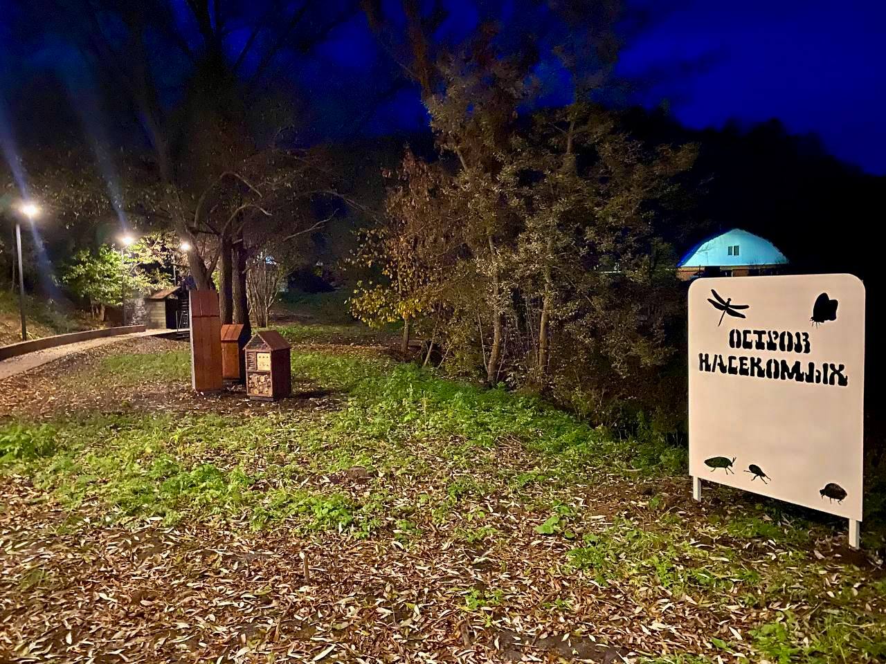 На территории появились первые «отели» для полезных насекомых, а участники детской архитектурной школы создали и установили ещё несколько таких домиков.